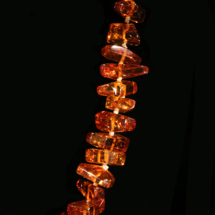 Lange, geknüpfte Kette mit flachen, zulaufenden Nuggets (à 8-16 mm) aus durchscheinendem Bernstein in hellerem Orange. Die Kette ist ca. 70 cm lang und hat ein Verschluss aus Silber.