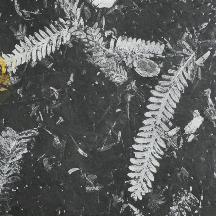Eindrückliche und sehr dekoratives Plattenpaar mit weiss versteinertem Farn auf schwarzem Schiefer.