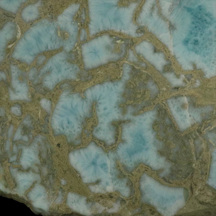 Diese dicke Scheibe misst 19x11 cm und enthält Zonen von himmelblauem Larimar, welcher nach dem konzentrischen Aufbau des Stammes angeordnet ist.