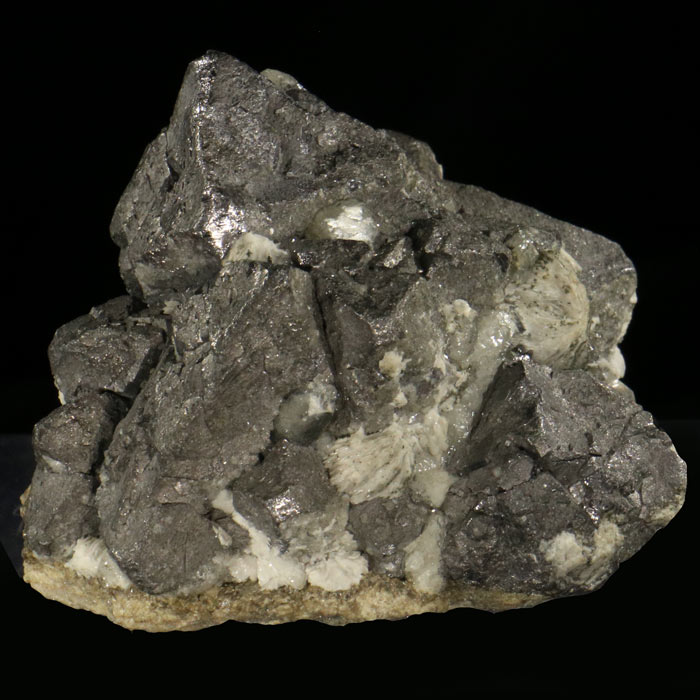 Gut ausgebildete (und seltenere) oktaedrische Bleiglanz-Kristalle mit einigen Baryt-Kristallbüscheln und glasigem Calcit.