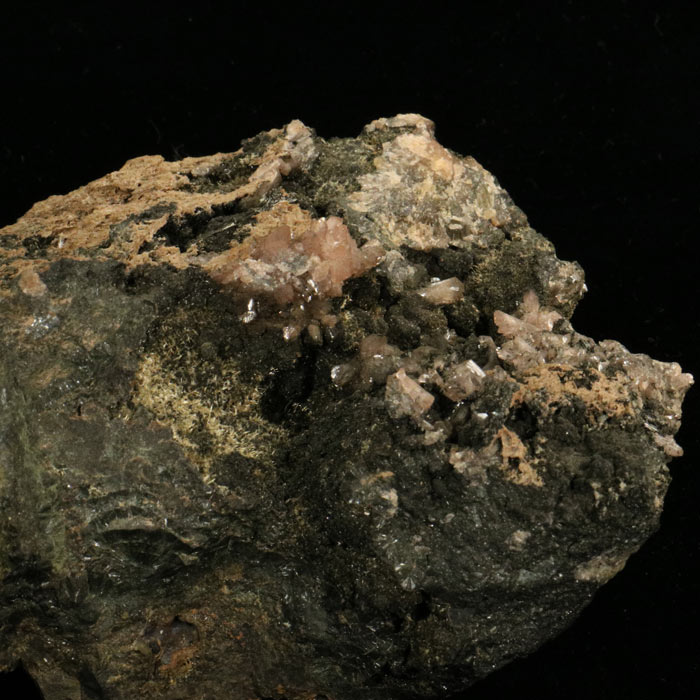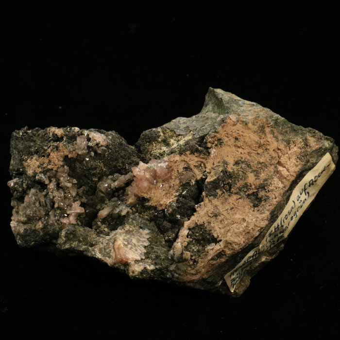Gleich drei eher seltene Mineralien auf einem Stück - aus alter, berühmter Fundstelle: rosa Hureaulith-Kristalle bis 5 mm, teils wunderschön ausgebildet, mit schwarzgrünem Rockbridgeit und gelbem, faserigem Strunzit.