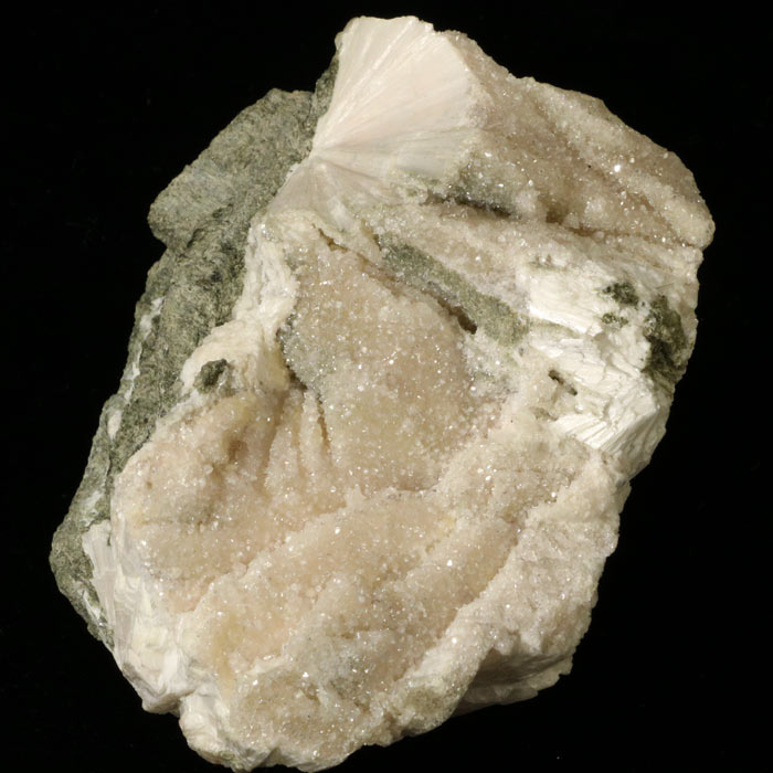 Ein sehr attraktives Stück mit strahligem Pektolith in teils deutlicher Rosafarbe, überzuckert von kleinen Apophyllit-Kristallen. Der beliebte hellblaue Larimar aus der Dominikanischen Republik ist übrigens mineralogisch Pektolith - hier also die europäische Variante davon.