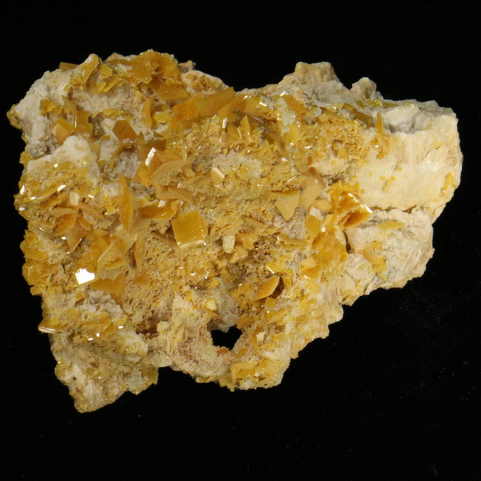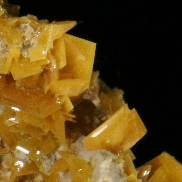 Hübsche Stufe mit vielen, glänzenden Wulfenit-Kristallen von oranger Farbe auf heller Matrix. Die meisten der Kristalle sind wunderbar intakt, einzig einer der grösseren Kristalle ist an einer Stelle angebrochen, was aber nur ganz wenig stört.