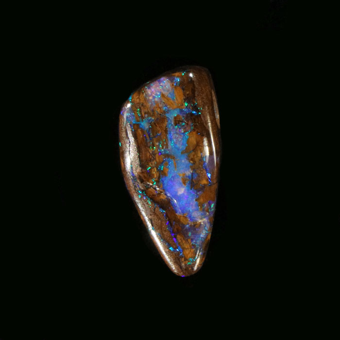 Leicht tropfenförmiger Boulderopal-Anhänger mit Querbohrung; feine Opal-Adern mit Farbspiel in Grün, Rot und Blau in brauner Matrix.