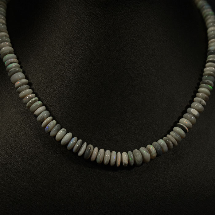 Lightning Ridge ist die weltberühmte Fundregion für Schwarzopale und Edelopale, es werden aber auch immer wieder orange klare Stücke gefunden. Diese Kette ist ein seltenes und attraktives Exemplar aus dieser Opal-Art. Da und dort sogar mit etwas Farbenspiel.