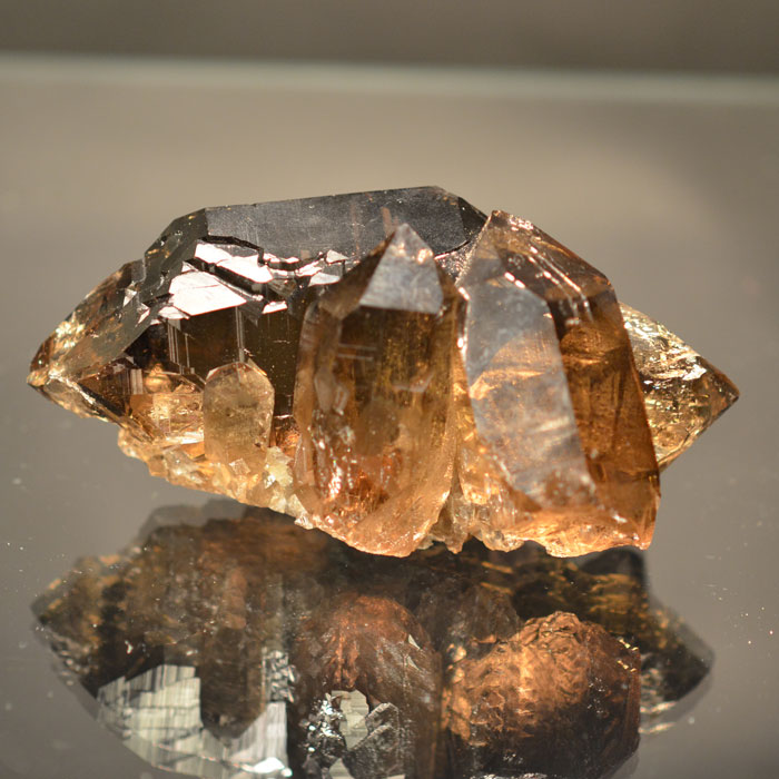 Zwei ineinander gewachsene, hochglänzende und teils klare, helle Rauchquarz-Gwindel auf etwas Quarz, begleitet von einer schönen Spitze.