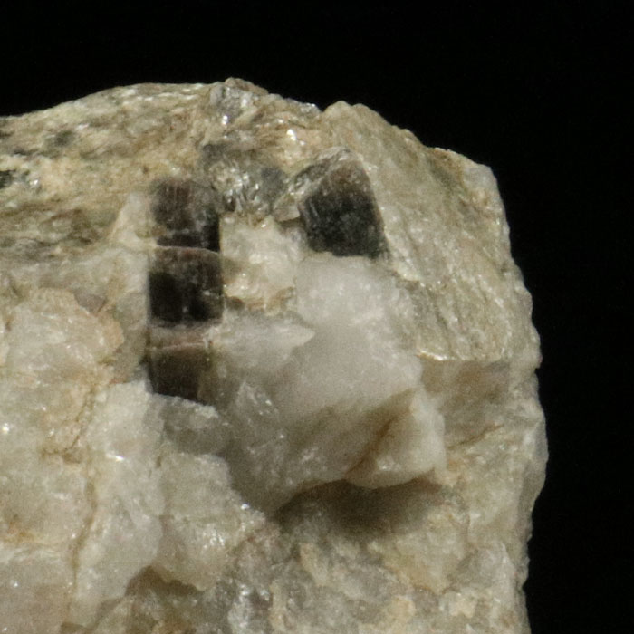 Eine Stufe aus derbem weissem Quarz, in dem diverse Andalusit-Kristalle mit typischem quadratischen Querschnitt (und typisch braun-graurosa Farbe) ein- und aufgewachsen sind.