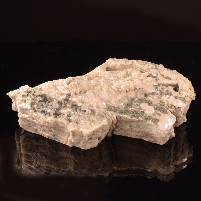 Eindrückliche Handstufe übersät mit sehr vielen glänzenden, milchigen Apatiten bis max. 3mm auf Matrix. Platte unten gesägt. 13 x 11cm.