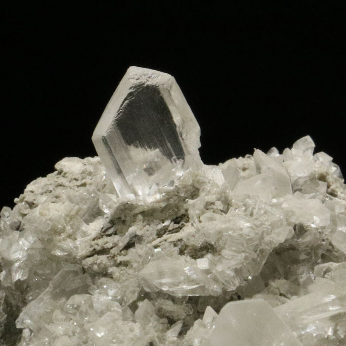 Der grösste Coelestin-Kristall (13 mm) zeigt ein deutliches Blau und ist nicht perfekt aber recht gut ausgebildet.