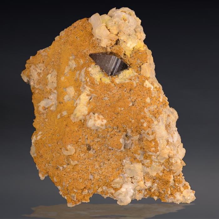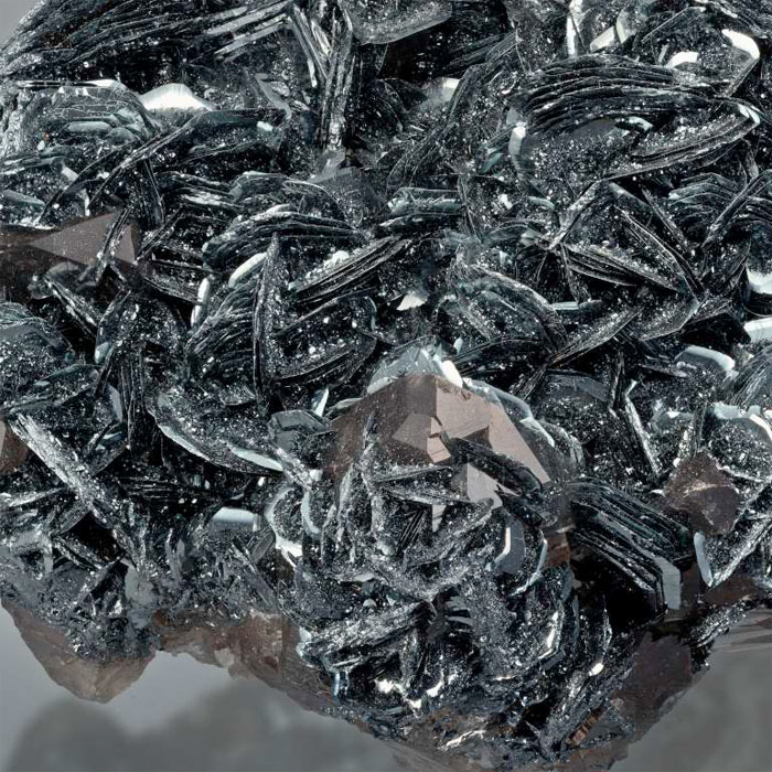 Absolut brillanter Hämatit in blättrigen Kristallen, dicht auf Rauchquarz. Eine spektakuläre Stufe, die jede Vitrine "belebt".