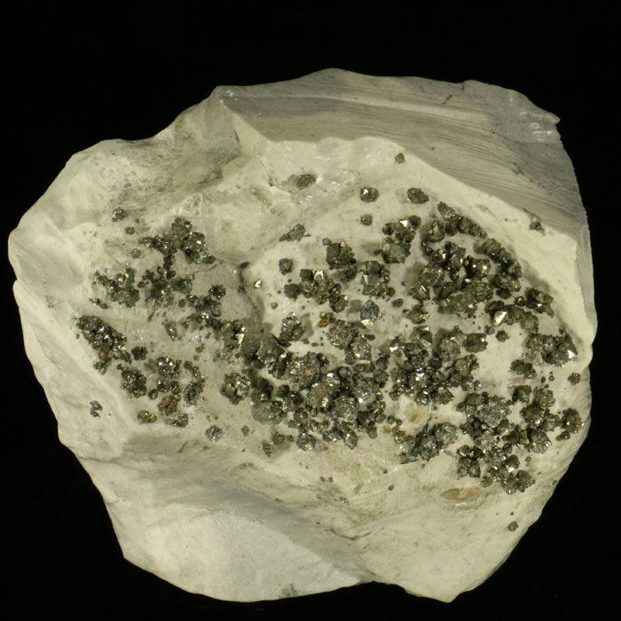Glitzernde, kleine Kristallaggregate (bis 4 mm, teils in typischer Speerkies-Ausbildung) von Markasit auf hellem Kalkuntergrund.