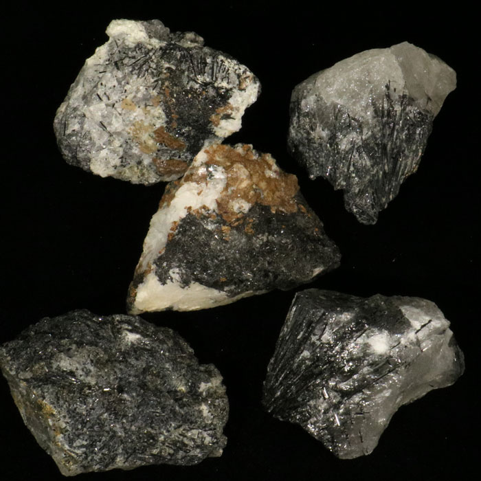 Für die Schweiz ein seltener Anblick: Rohstücke mit viel strahlig kristallisiertem Schörl-Turmalin, verwachsen mit derbem, grauem Quarz und teilweise auch braunem Dolomit (Ankerit).