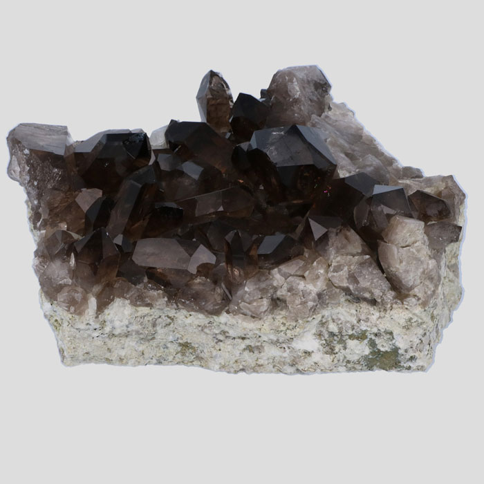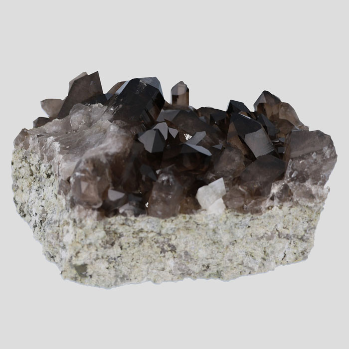 Rauchquarz von wunderbarer Qualität (dunkle Farbe, hoher Glanz, schöne Klarheit und alle wichtigen Spitzen intakt) auf ganz hellem Granit, vergesellschaftet mit einigen weissen Adular-Kristallen. Eine Alpine Idealkombination.