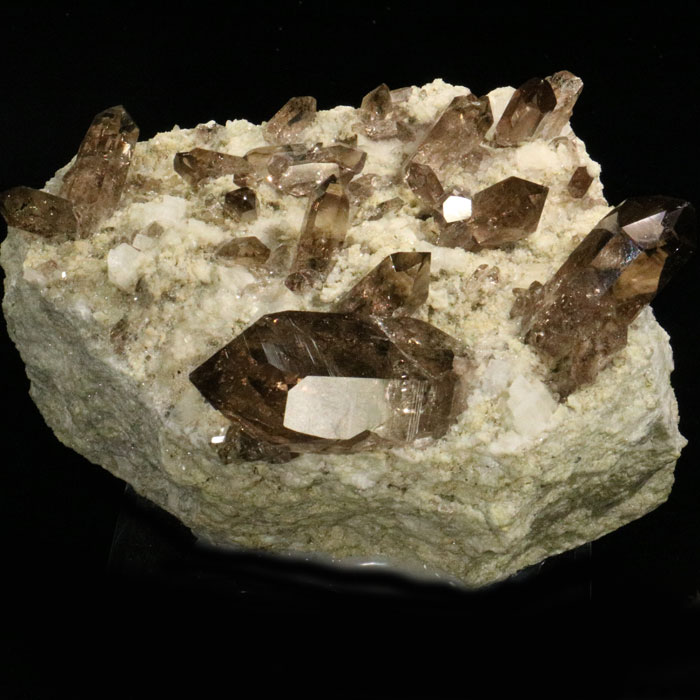 Der Rauchquarz ist von erlesener Qualität und mit Ausnahme einer Spitze (die eine Druckstelle von rund 2 mm zeigt) auch shcön intakt.