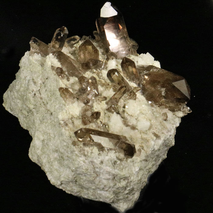 Ein schauprächtiges Stück, das typischer nichtz sein könnte für die Schweizer Alpen: Hochglänzender, teils glasklarer Rauchquarz mit kleinen weissen Adular-Kristallen auf einem soliden Stück Granit!