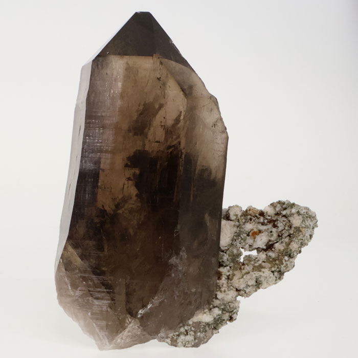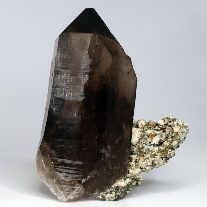 Dunkle, glänzende Rauchquarzspitze von stattlicher Grösse (16 cm lang, 7.5 cm breit), auf etwas körnigem Granit.