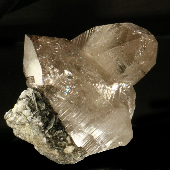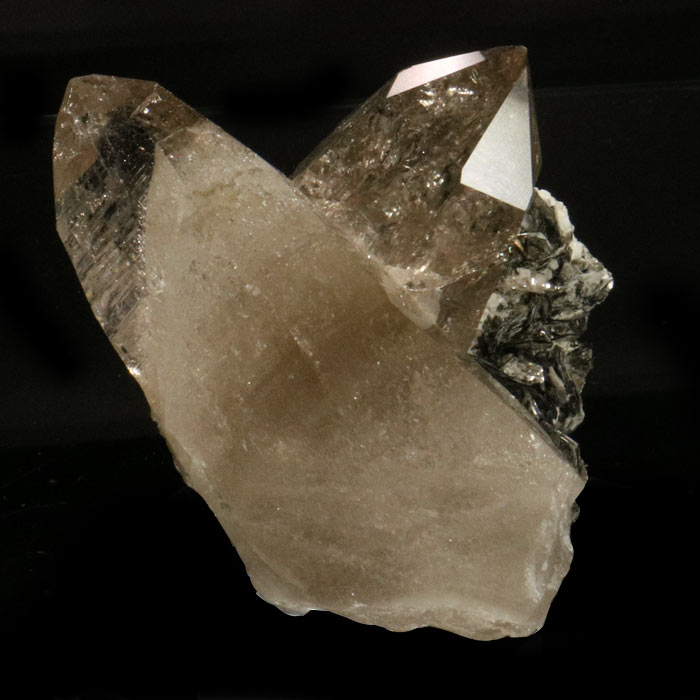 Ausserordentlich harmonische Rauchquarz-Stufe mit zwei quer zueinander stehenden Spitzen in schönem Tessiner Habitus, welche zudem hochglänzend sind und eine warme rauchige Farbe zeigen. Sie stehen vor etwas Muttergestein mit gut ausgebildeten Muskovit-Kristallen und Albit.