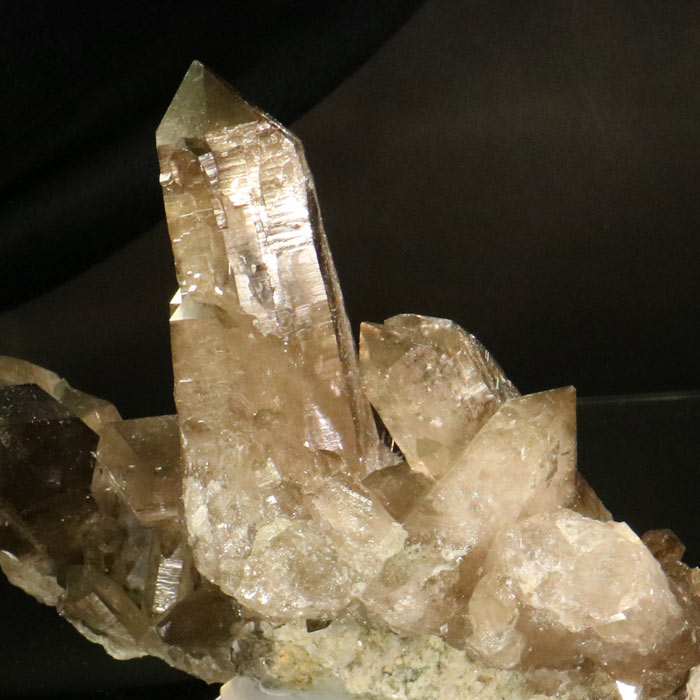 Der zentrale Kristall zeigt vorne einige "Schleier". An der Rückseite der Spitze besitzt er eine Druckstelle, welche von vorn aber nur ganz schlecht zu sehen ist und daher kaum stört. Die übrigen Spitzen sind intakt und teils auch glasklar.