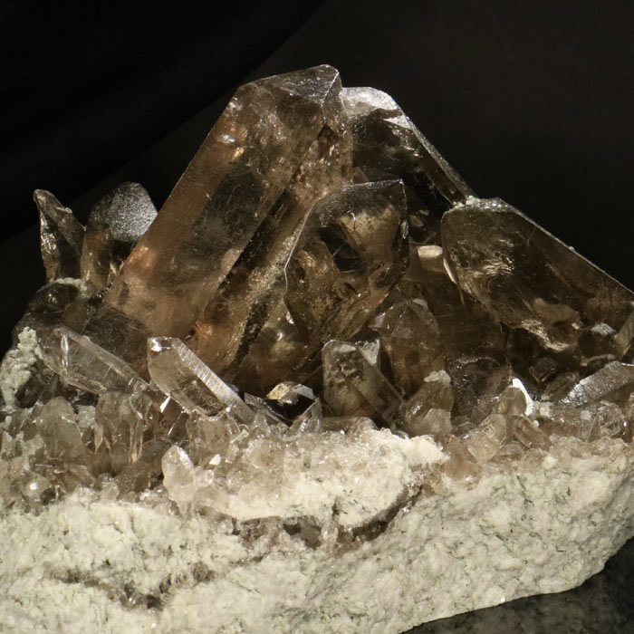 Grosse, eindrückliche aber dennoch preisgünstige Rauchquarz-Stufe mit bis 10 cm langen Spitzen auf hellem Granit.