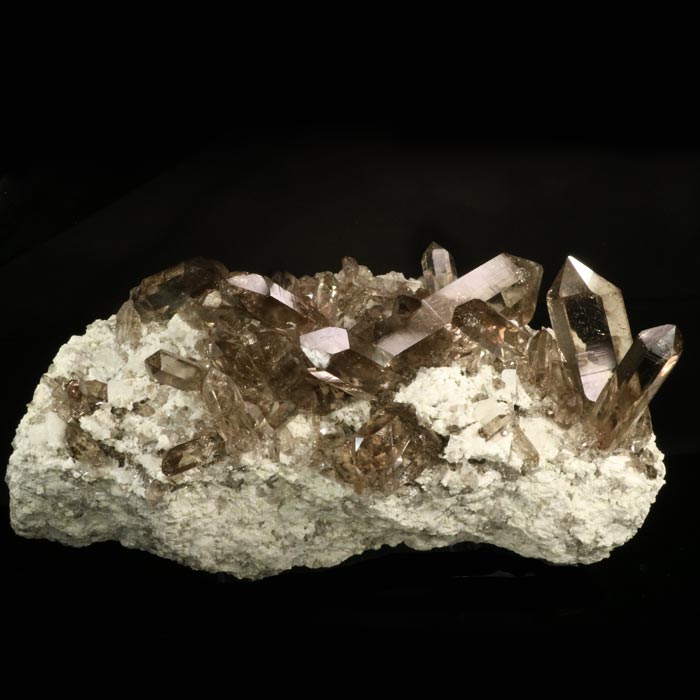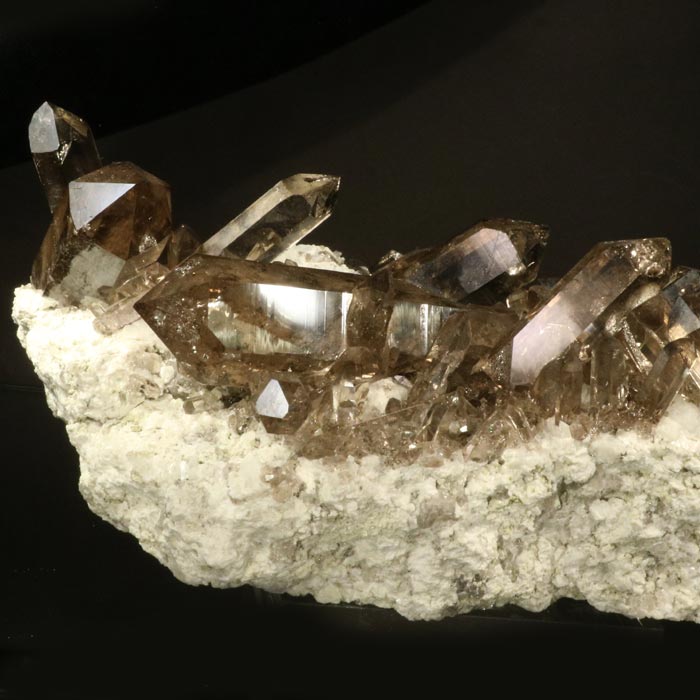 Eine ausserordentlich hochstehende Rauchquarz-Stufe mit Kristallen von mittlerer bis dunklerer Rauchfarbe auf sehr hellem Granit. Die Kristalle sind eher schlank prismatisch, alle intakt, der Aufbau ist attraktiv - ein echter Glücksfall aus der Göscheneralp.