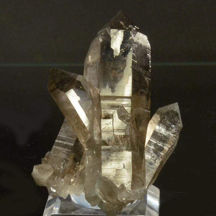 Feines, kleines Rauchquarz-Grüppchen mit schön glänzenden, leicht rauchigen Spitzen und etwas Muttergestein. Durch den Limonit-Belag entsteht ein goldig gelber Farbton.