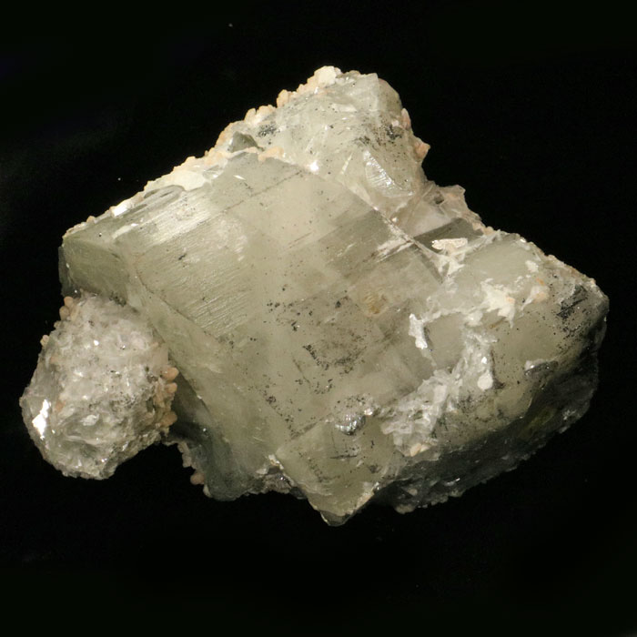 Ein Stück, bei dem es einiges zu entdecken gibt: Grosser Adular-Kristall von grau-weisser Farbe, welcher einseitig komplett von lachsfarbenem Desmin überwachsen ist und auf der Vorderseite von feinen Hämatit-Kristallen bestäubt ist und von weissen, blättrigen Calcit-Kristallen und -Teilkristallen belegt ist.