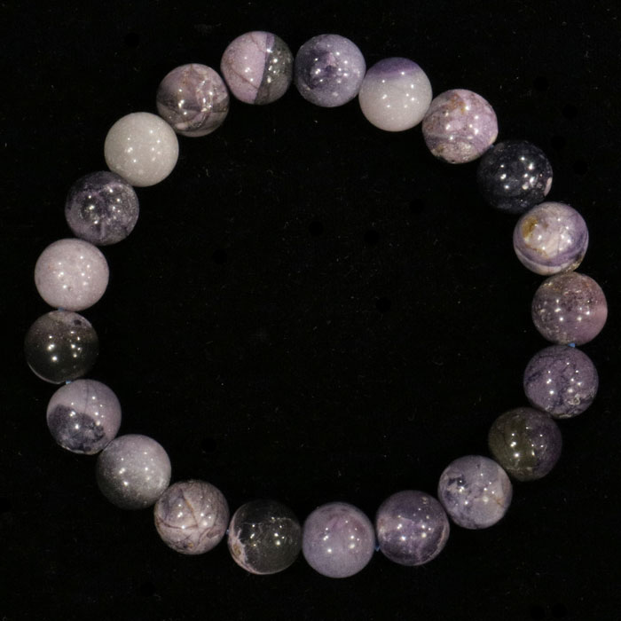 Originelles Armband aus dem sogennanten "Tiffany-Stein", einer Mischung aus lila Fluorit und Opal. Die geschliffenen Kugeln sind etwa 9 mm im Durchmesser und an einem stabilem Gummiband aufgezogen. Der Innenumfang beträgt knapp 17 cm.