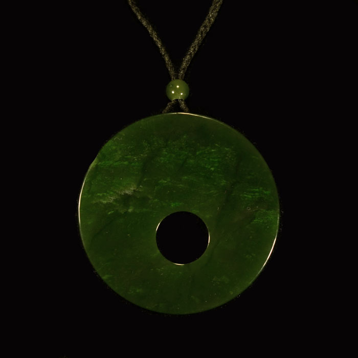 Faszinierendes durchscheinendes Amulett aus Nephrit-Jade. Diese runde Scheibe wurde zur Mitte hin immer dünner geschliffen, sodass das Herzstück fast an eine Sonne erinnert. Das Stück hat einen Durchmesser von ca. 5 cm, oben 0.8 cm und unten 0.4 cm breit und wie erwähnt zur Mitte hin (konkav) bis auf ca. 0.15 cm geschliffen.