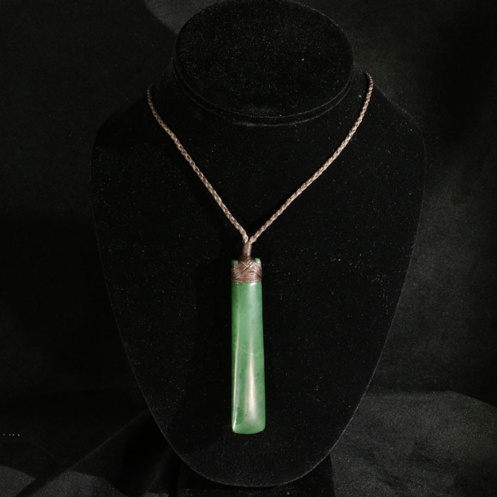 Erschwingliche Kunst: Ein grosses sogenanntes "Toki" aus der Maori-Kultur. Der Anhänger ist mit einem braunen Garn befestigt und geknüpft. Länge: 8cm.