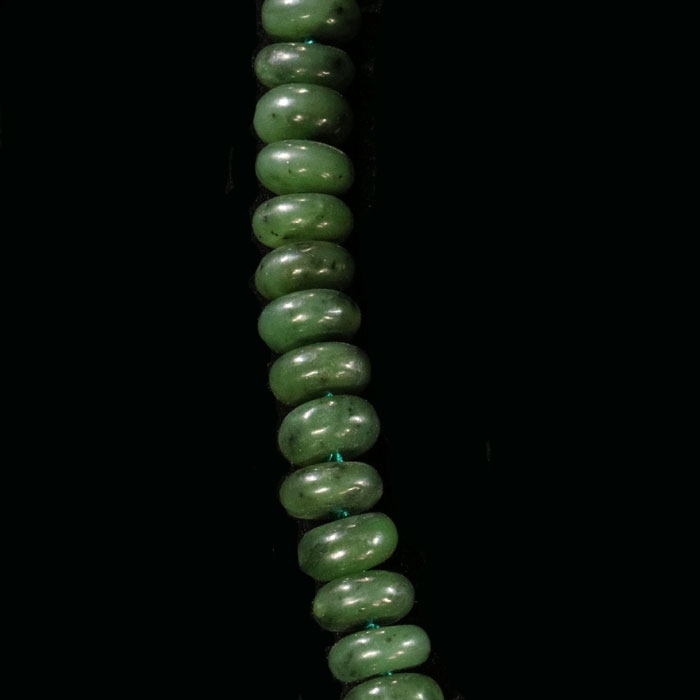 Geknüpfte Kette mit Rondellen (à 1 cm) aus Nephrit-Jade in dunklem Grün. Sie ist ca. 51 cm lang.