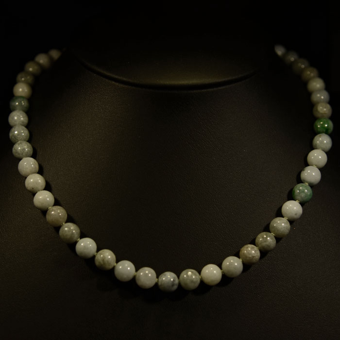 Bezaubernde Kette aus Nephrit-Jade in intensiv dunklem Grün. Die Kugeln sind ca. 8 mm gross. Das Schloss ist aus 925 Silber und eignet sich für schmale Hälse auch zum doppelt tragen, oder ganz einfach lang. Die gesammte Kette ist nach jeder Kugel geknüpft, was sie sehr stabil und wiederstandsfähig macht. Ein wunderschönes Unikat.