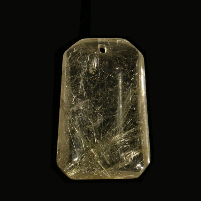 Hübscher Rutilquarz-Anhänger in sehr spezielle Form geschliffen mit Frontalbohrung. Die Rutilnadeln sind gut zu sehen und zeigen sich in schöner, goldiger Farbe.