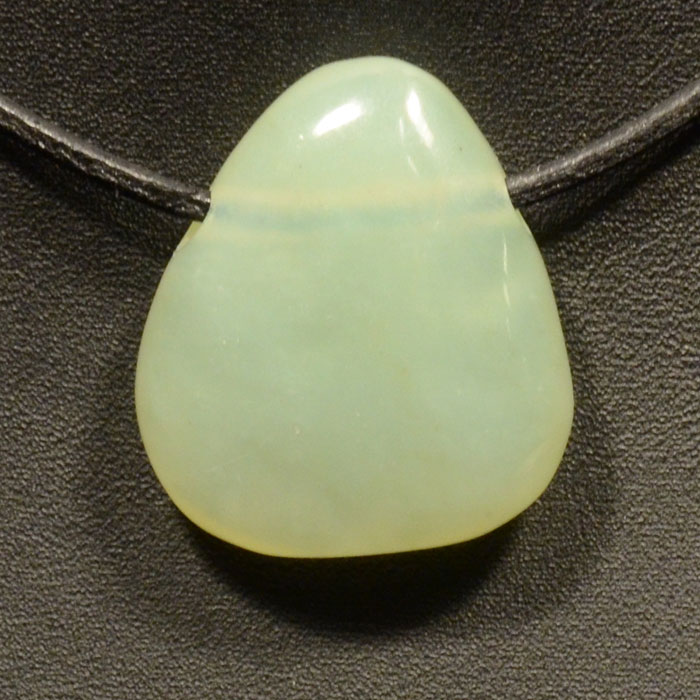 Durchscheinender Serpentin, getrommelt, mit Bohrung zum Tragen am Leder- oder Textilbändel.