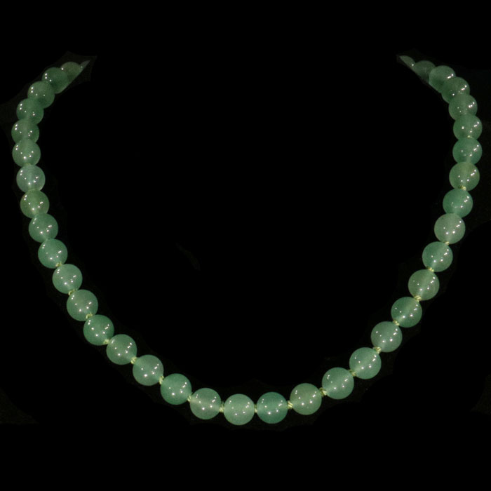 Geknüpfte Kette aus Aventurin-Kugeln à 8 mm, mit Schliesse aus 925er Silber. Beim Aventurin handelt es sich um ein Gestein aus feinkörnigem Quarz, genannt Quarzit, welcher mit grünen Glimmerkristallen (Fuchsit) verwachsen ist.
