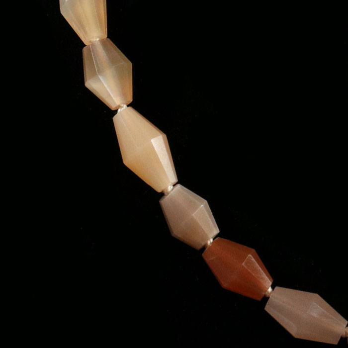 Elegante, geknüpfte Kette mit facettierten, länglichen Beads (11-15 mm lang) aus Mondstein in verschiedenen Farben; der leichte Farbverlauf wird im Zentrum mit einem orangenen Bead abgeschlossen. Die Kette ist ca. 43 cm lang und hat ein Schloss aus Silber.