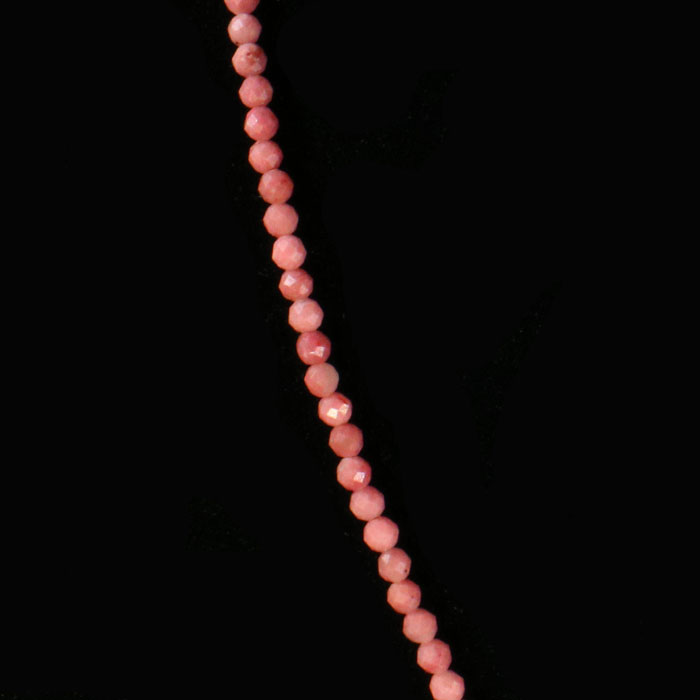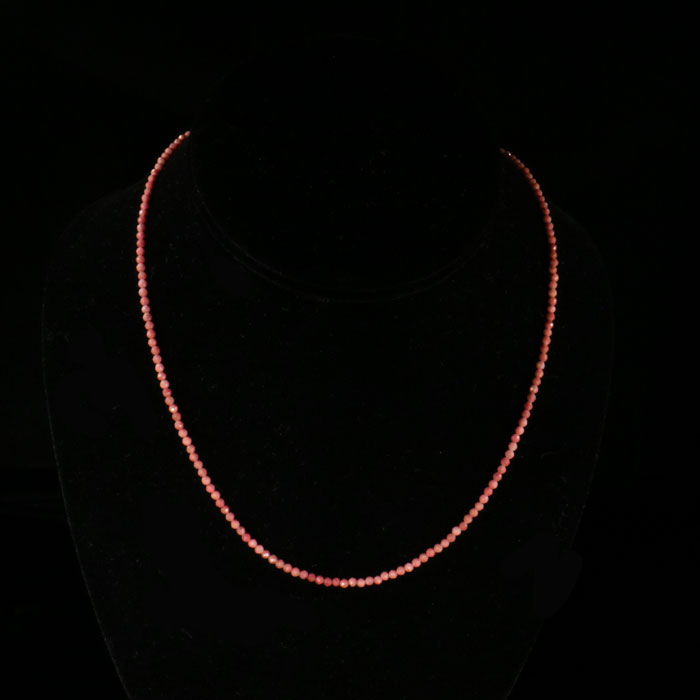 Feine Kette mit facettierten Kugeln à 2.5 mm aus Rhodonit in kräftigem Rosa, mit Verschluss aus Silber.