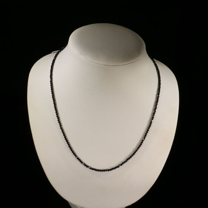Feine Tansanit-Kette in gehobener Qualität. Die facettierten Rondellen zeigen eine schöne Farbe. Der Durchmesser der Steine misst etwa 3.6 mm, Länge: 45-49 cm (inkl. Verlängerungskettchen).