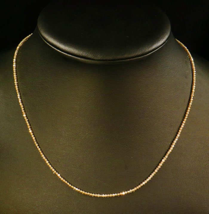 Feine Tansanit-Kette in gehobener Qualität. Die facettierten Rondellen zeigen eine schöne Farbe. Der Durchmesser der Steine misst etwa 3.6 mm, Länge: 45-49 cm (inkl. Verlängerungskettchen).