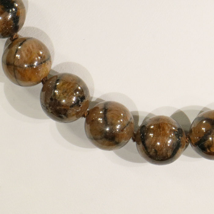 Ein echtes Unikat: Diese ganz spezielle Chiastolith (Kreuzstein) Kette in extralanger Grösse gibt es nicht oft zu sehen. Die Kette ist auf Perlseide aufgezogen und nach jeder Perle geknüpft, was die Kette besonders stabil macht. Durchmesser der Perlen: 12 mm. Schliesse aus 925er Silber, eignet sich somit zum doppelt oder einfach tragen.