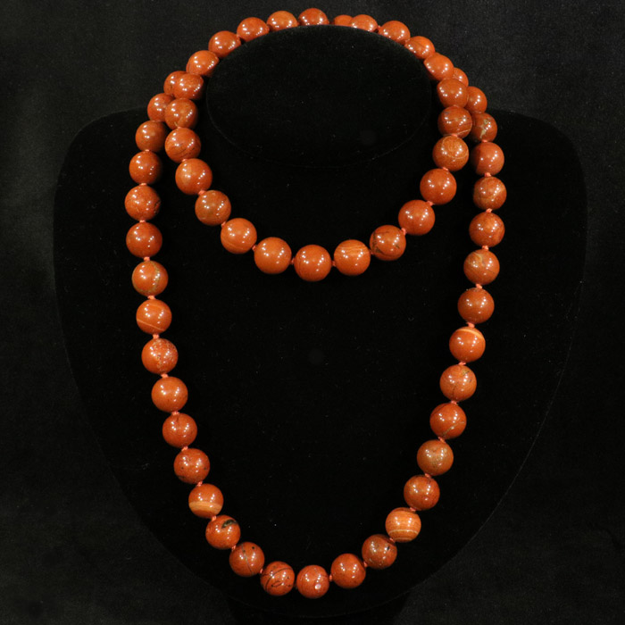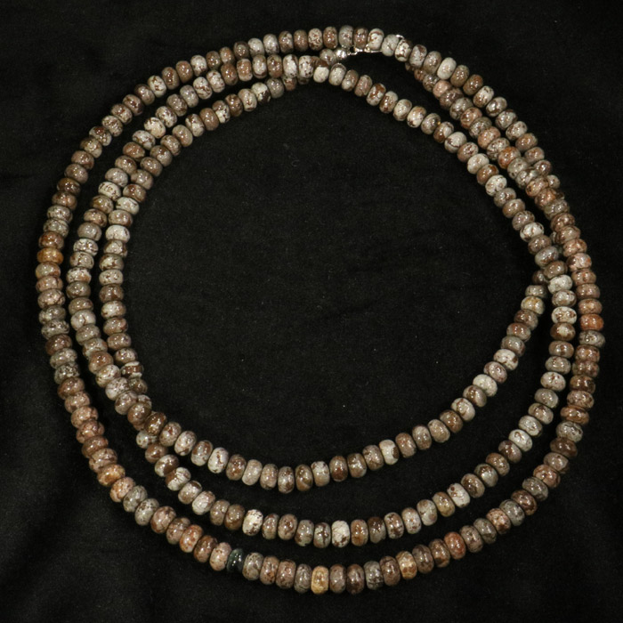Extralange Kette aus polierten, Rhyolit-Rondellen, mit toller Musterung und Farbe. Daher passend zu vielem zu tragen.
