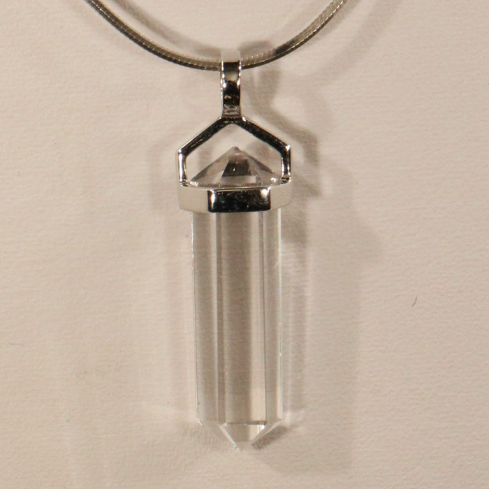 Bergkristall, zu einem sechsseitigen Doppelender geschliffen, in Silber zu einem Anhänger gefasst. Die Fassung besteht aus 925er Silber.
