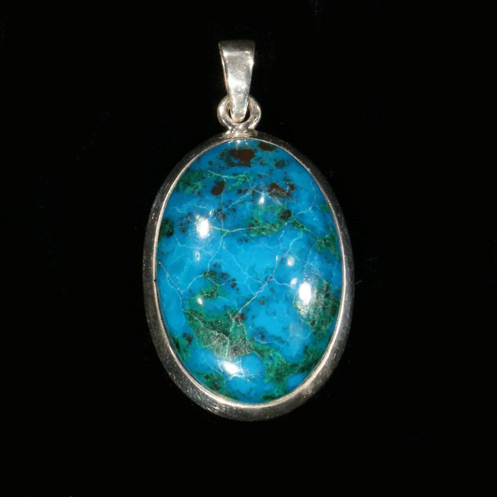 Ovaler Anhänger aus Chrysokoll in intensiver blaugrüner Farbe mit schöner Musterung durch verschiedene Einschlüsse. Der Stein ist in Silber gefasst und misst inkl. Öse ca. 4.2x2.1 cm.