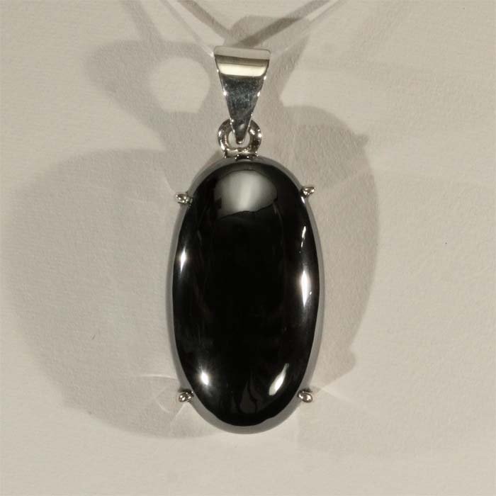 Ein schmalovaler, hochglänzender Cabochon aus Hämatit in einer Viergriff-Fassung aus 925er Silber.