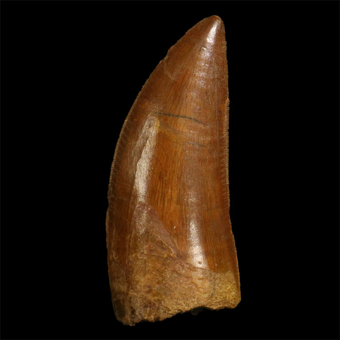 Aus der Kreidezeit, rund 95 Millionen Jahre alt. Grösse: 6x2.6 cm, mit komplettem Zahnschmelz und teilweise Erhaltung der seitlichen Schneidkanten. Aus El Begaa, Taouz, Marokko.