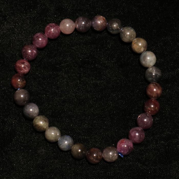 Eine etwas andere Art des Saphir-Schmucks: Armband mit Kugeln à 7 mm aus durchscheinendem Saphir in diversen Farben: Die Palette reicht von Rosa und Lila über Grau und leicht Grünlichgrau zu Graublau. Manche Kugeln zeigen Sternschiller.