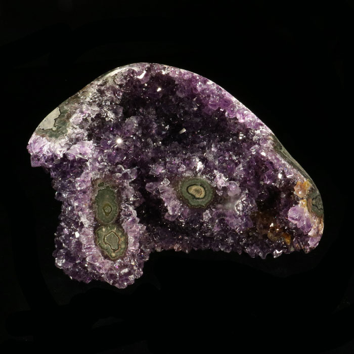 Sehr attraktives Amethyst-Drusenstück mit schön ausgebildeten, im Licht glitzernden Kristallen in tiefvioletter Farbe. Das Stück misst ca. 14x10 cm.