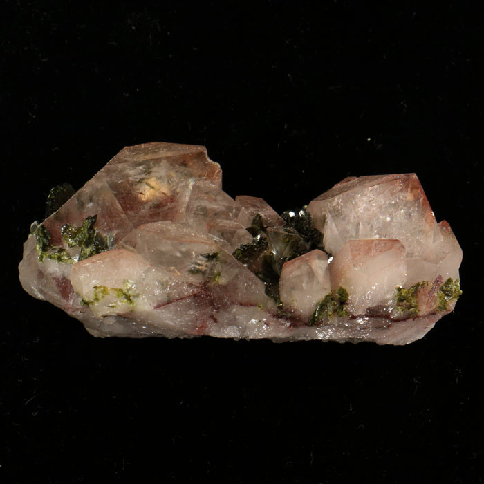 Kleine Grupe mit hellem, teils klarem Phantom-Amethyst, "verziert" mit hochglänzendem, dunkelgrünem Epidot. Eine der beiden Amethyst-Hauptspitzen ist leicht beschädigt.