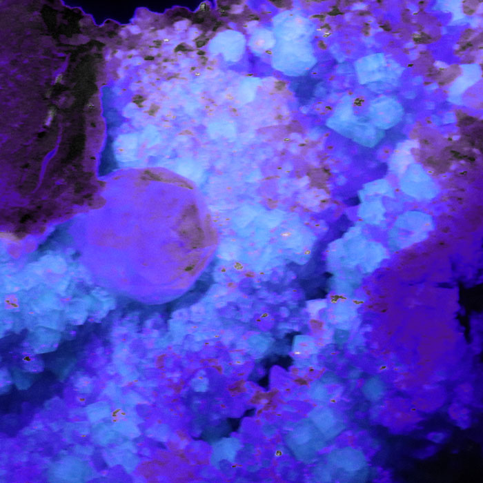 Der Fluorit zeigt eine sehr starke hellblaue Fluoreszenz unter UV-Licht (und leuchtet im Dunkeln zudem etwas nach).