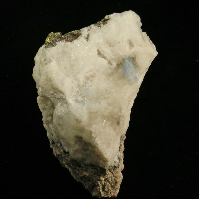 Eine für Schweizer Verhältnisse einmalige Kombination: blauer Coelestin, eingebettet in weissem Calcit (an einem Ort mit glitzernder Druse) und derbem Kupferkies!
