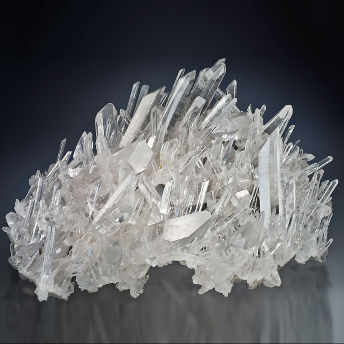 Ausserordentlich schöne Bergkristall-Stufe mit teils normalen und teils sehr schlanken, langen Spitzen (fast als Nadelquarz zu bezeichnen).